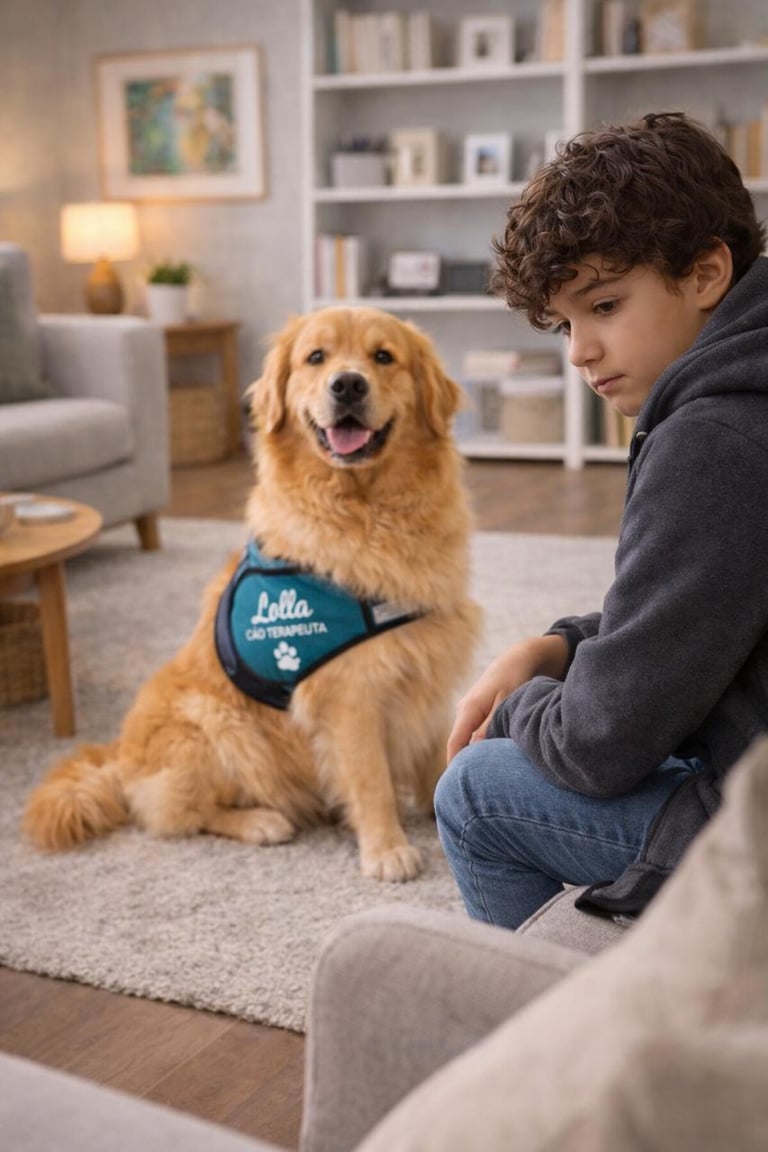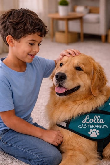 Quando indicado clinicamente, esse processo pode contar com a participação da Lolla, cão terapeuta da raça golden retriever, em um trabalho estruturado de aproximação progressiva, sempre com cuidado, previsibilidade e respeito ao tempo de cada pessoa.